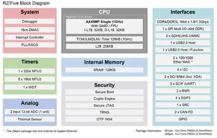 RZ/Five(図2)には、13mm x 13mm BGA-361と11mm x 11mm BGA-266の2つのパッケージオプションがあります。BGA-361はギガビットイーサネット2chを備え、 BGA-266はギガビットイーサネット1chを備えています。