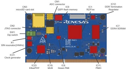 RZ/Five評価ボードキットは、モジュールボード(SOM)(図3)とキャリアボードで構成されています。キャリアボードはSMARC v2.1規格に準拠したRZ/G2L、RZ/G2LC、およびRZ/V2L用のモジュールで共通に使用することができます。これにより、これらのデバイス間でシームレスかつフレキシブルな評価が可能になります。