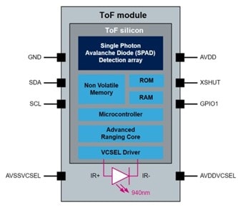 図1:AMRラゲージに最適なVCSEL ToF赤外線近接センサ 511-VL53L5CXV0GC/1の機能図。(画像:マウザー・エレクトロニクス)