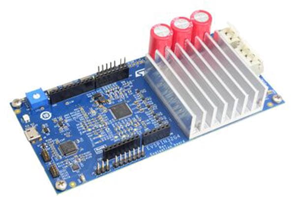 図2:STMicroelectronics STSPIN32G4のような高集積モーターコントローラ/MCUは、先進的なモーター制御機能と処理をシングルパッケージで提供できます。上の図はSTMicroelectronics EVSPIN32G4デモボードとSTSPIN32G4システムインパッケージ(SiP)、およびSTL110N10F7パワーMOSFETです。(画像:マウザー・エレクトロニクス)