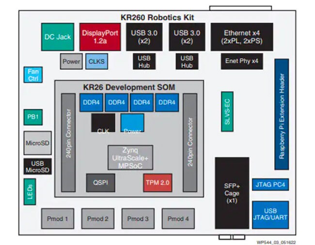 スターターキットは、AMD K26 SOMをベースとしており、4GBのDDR4メモリ、オンボード電源、ブートオプション、セキュリティ強化のためのTPM 2.0、キャリアカードをIOマッピングするコネクタを搭載しています(図2)。さらに、最大クロックは1.33GHz(TOP)です。この速度のロジックは、コード駆動の意思決定よりも一貫して優れています。K26 SOMは、ビジョンAI、ロボット、産業用通信/制御など、特定のアプリケーション向けに設計されたキャリアカードにプラグインできます。