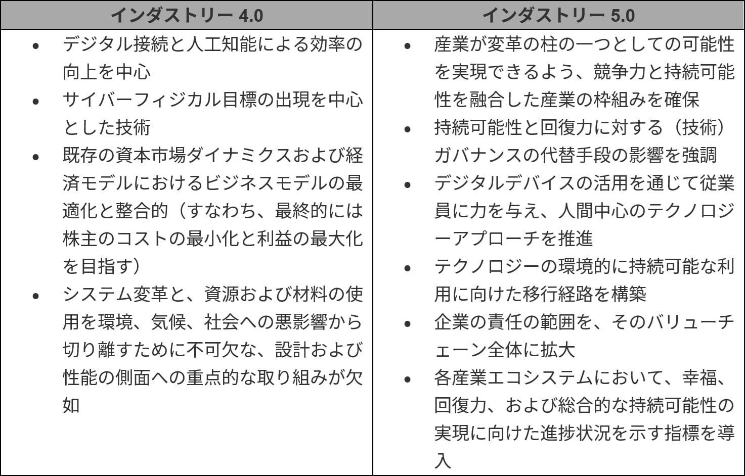 表 1.インダストリー 4.0 に対するインダストリー 5.0 の位置付け。(出典:欧州委員会研究・イノベーション総局による「インダストリー 5.0、ヨーロッパの変革ビジョン」は CC BY 4.0 のライセンスで公開されています)