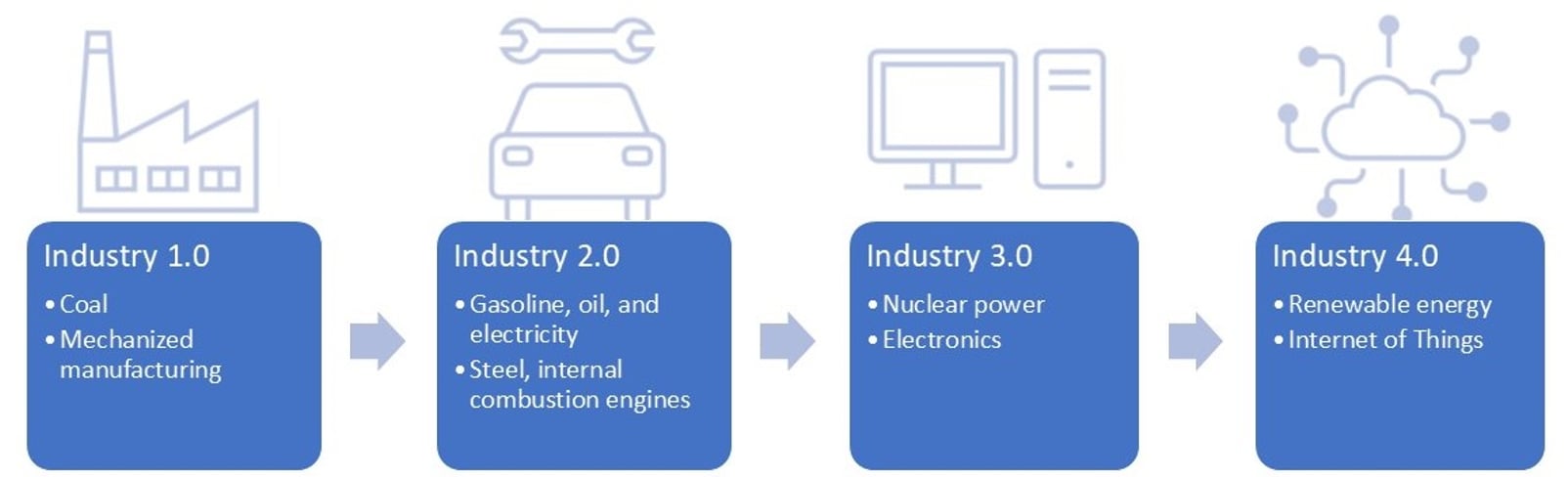 図 1:最初の 4 つの産業革命は、エネルギー生成方法と技術革新によって特徴づけられました。(出典:著者)