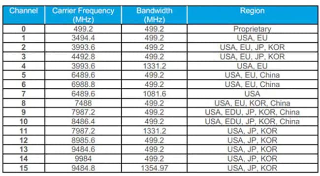 図1から、UWBの搬送波周波数と帯域幅は、通常、世界中で3.5GHzから9.5GHzの範囲であることがわかります。一部のUWBチャネルでは、9484.8MHzの搬送波周波数で 1354.97MHzという高い帯域幅が可能です。これは通信技術としては非常に広い帯域幅ですが、UWBはタイムパルス方式を採用しているため、スループットは27Mbpsに制限されます。