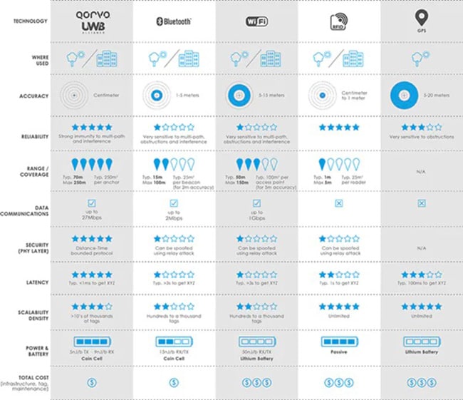 図2:UWBをBluetooth、Wi-Fi、RFID、GPSと比較 (出典:Qorvo)