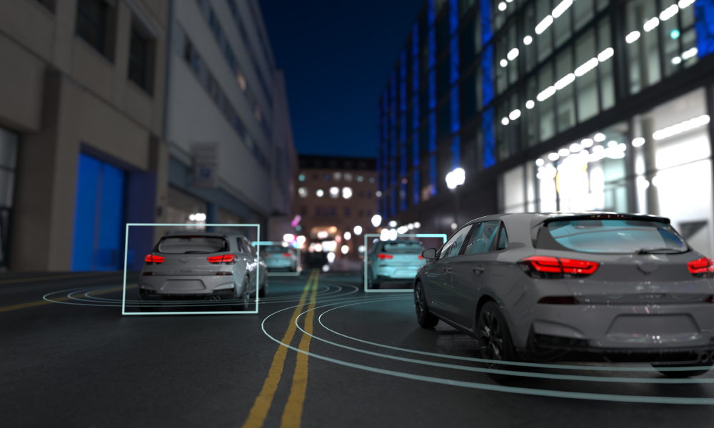 車両検知技術は、こちらの例に示す通り広い範囲ですでに実際に利用されています。私たちが普段運転する個人の乗用車でも、複数の車載用バックカメラを搭載しているものがあります。このシステムは、車両後方の一定距離以内に別の車両が入り、追い越そうとしてきたときに起動します。車両後方に別の車両が検知されると、アラートが発生し、速度を落とすよう促されます(図1)。また、自動運転の分野でも応用されており、周辺の車の位置から各車の速度、距離、及びその他の要素を分析し、それに応じて車の進路を自動調整します。