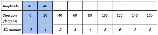 今回は、補間について解説するにあたり3つの表を使います。それぞれの表の1行目は算出された振幅、2行目は定めたビン数で180度を割ったビンの方向値を示します。3行目は、0から始まるビンのシーケンス番号です。
